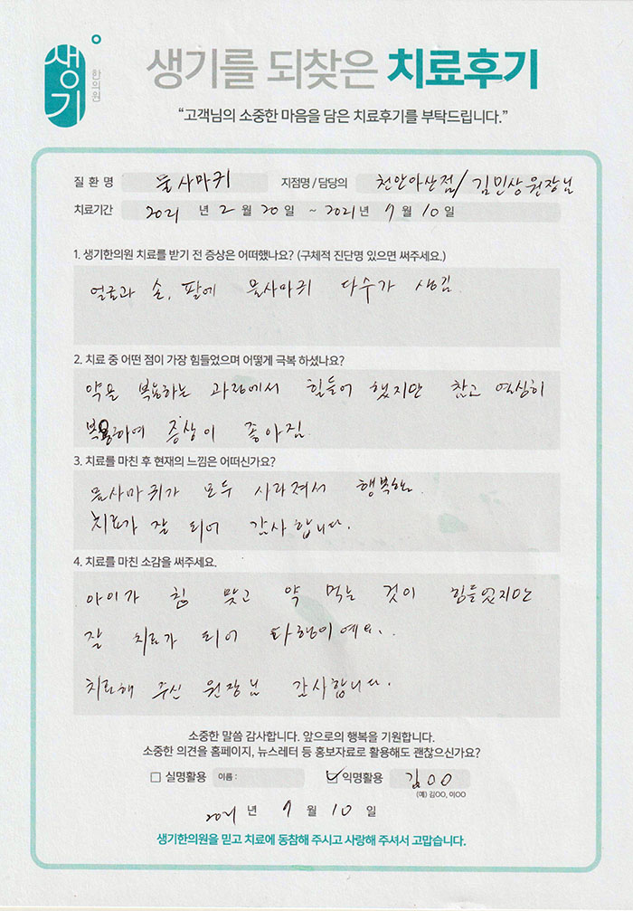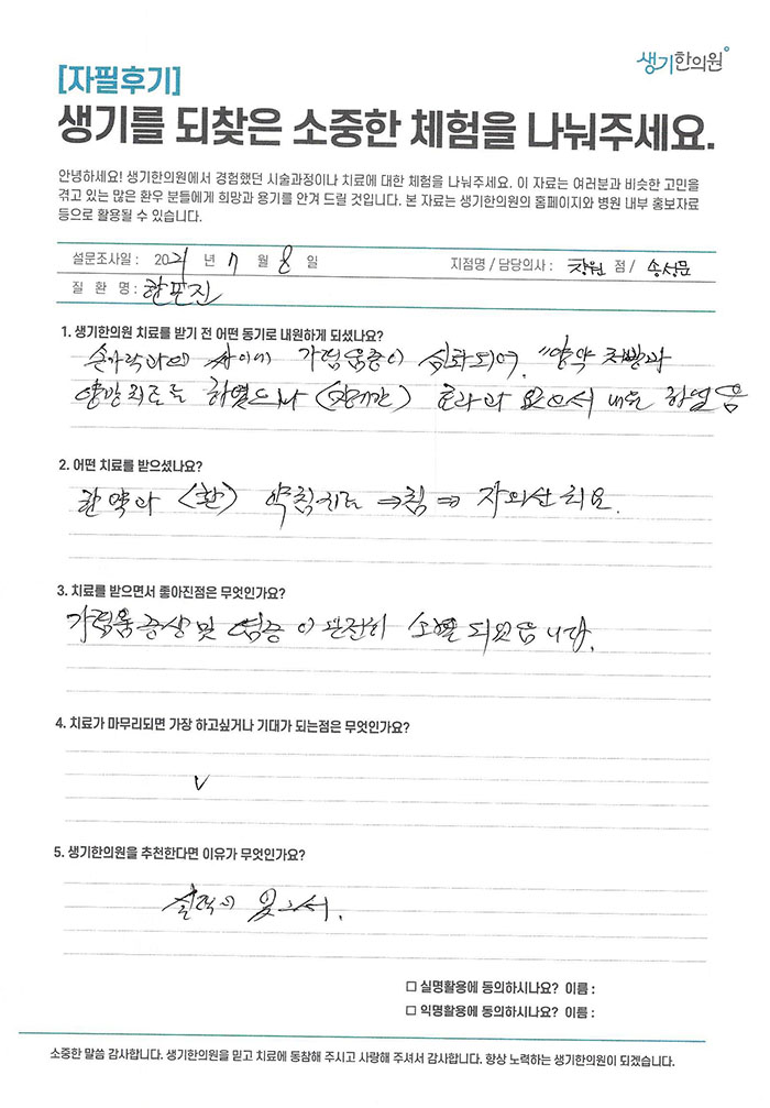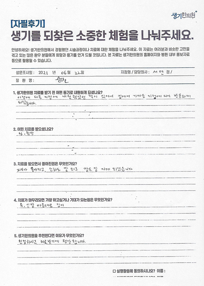 생기한의원과 함께하신 생생한 자필 및 영상 후기를 소개합니다.