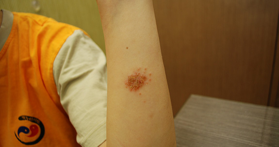 초기에는 홍반성 구진과 소수포로 나타나 점차 커지고 융합되어 동전 모양으로 변합니다.