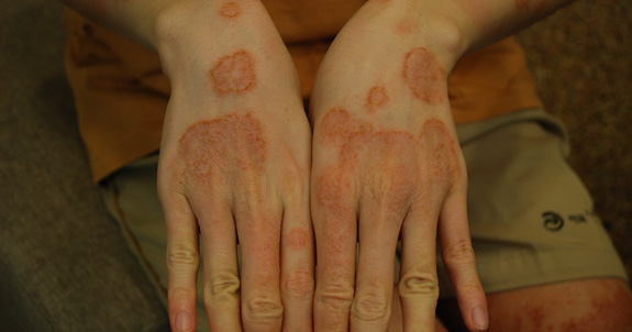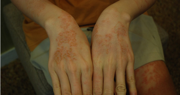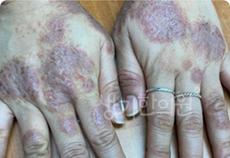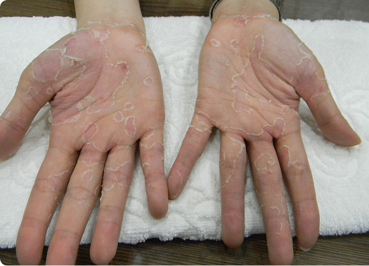 • 손에 비늘을 동반한 홍반 및 갈라짐, 물집, 진물이 생기고 심한 건조감과 및 손등까지 번질 수 있습니다.