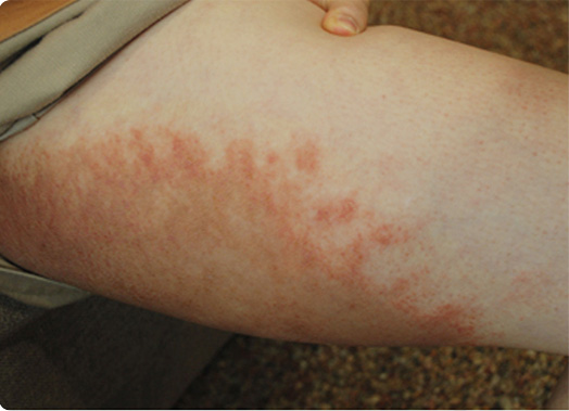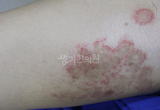 • 심한 가려움을 동반하며, 경계가 분명한 바퀴 모양으로 점점 다른 부위로 넓어지고 색소 침착이 일어납니다.